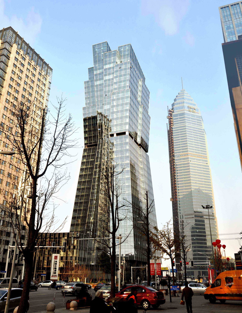 the tapering skyscraper by chinese architect liu xisang is located in the rapidly developing shaoxing city in the zhejiang province in china. reminiscent of ancient glasses of wine called jiu zun, the 137 meter tower seeks to be a symbol for the area. it is part of the modern business center master plan designed by SOM, which formed the town of didang. divided into 4 horizontal layers, the building’s first 18 floors slope inwards with the upper volume angled to tapering out. the folding elements of the structure progressively become smaller as it ascends towards the sky, emphasizing its sense of verticality.