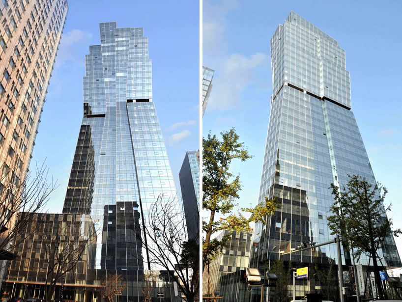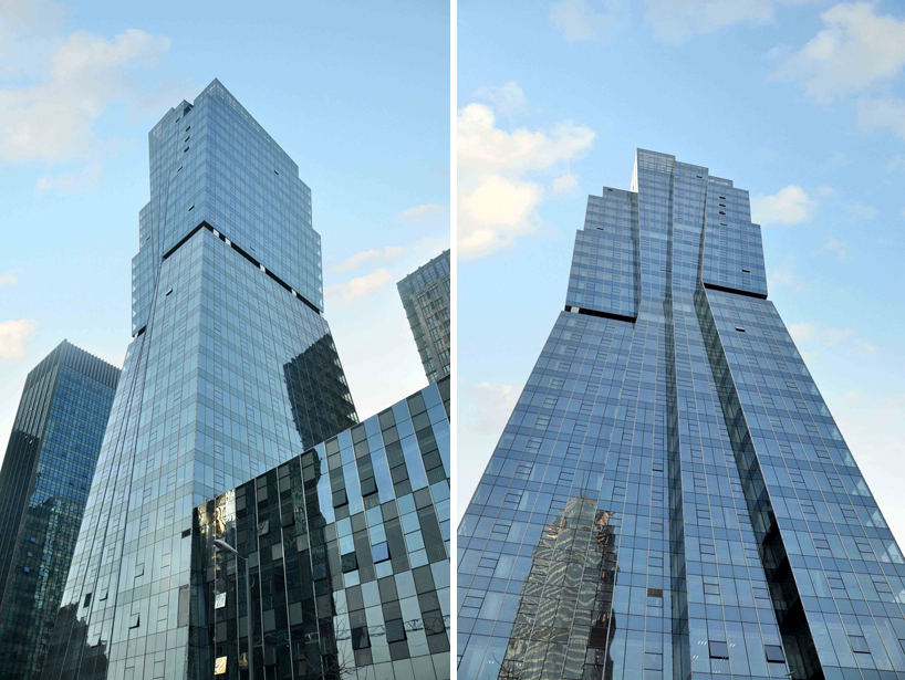 the building’s first 18 floors slope outwards with the upper volume tapering inwards